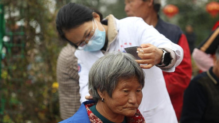 在测血糖、血压的地方,护士彭琰也细心地叮嘱老人:“放松手,张开手别使劲。”“给您棉棒,按好别着急松开,等不流血了再松开。”
